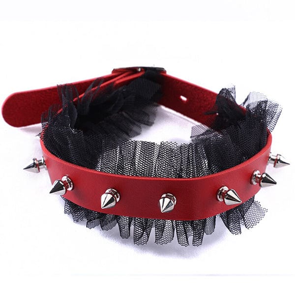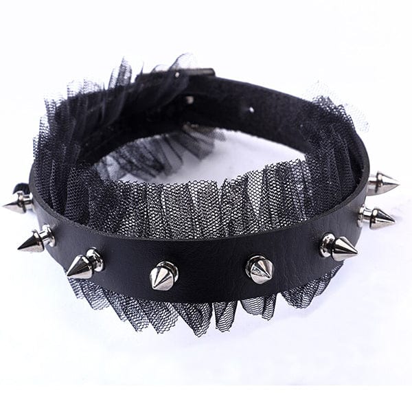 A handmade goth-style choker made with black lace frill and vegan leather choker studded with aluminum spikes. This gives you a classic gothic or vampire look to add to your personal fashion statement.