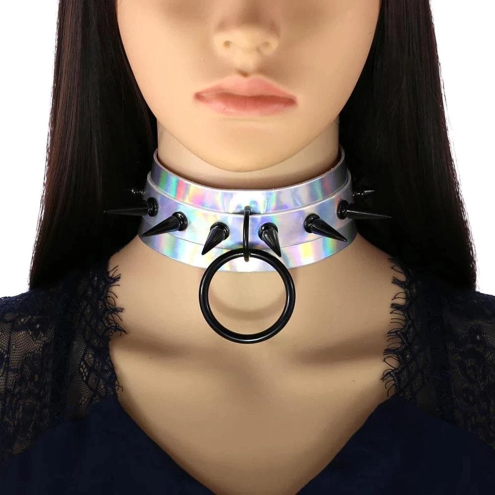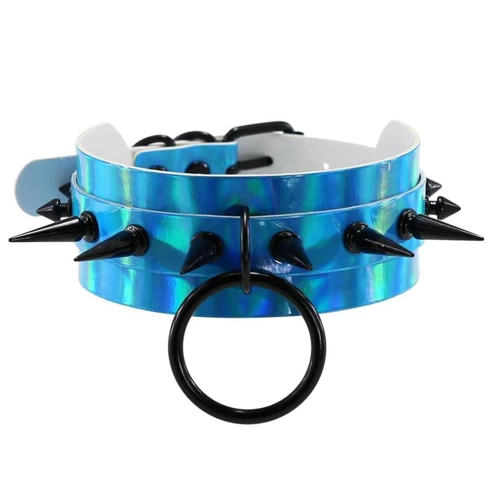 Fall in love with our Sharpy Holographic Choker Necklace - double-layered laser hologram leather base, with statement O-Ring, black spikes, and adjustable back. Brings any outfit to life.