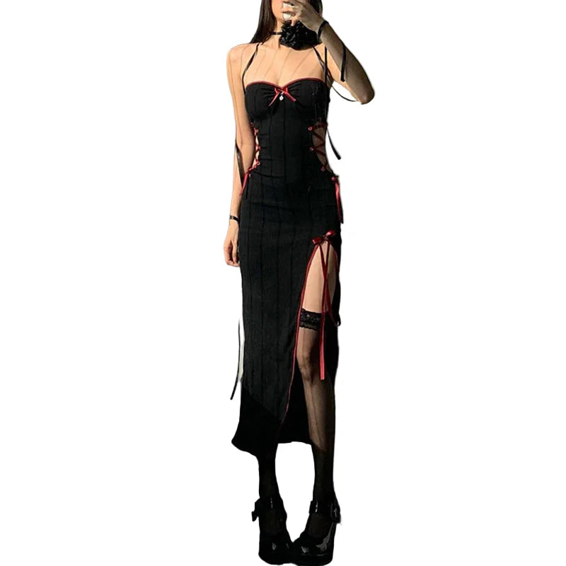 Turn heads with the Sablelace, a stunning blend of gothic allure and modern sensuality. This black and red lace dress is designed for those who embrace boldness. The empire waistline accentuates your silhouette, while the high split adds a daring touch to its midi length. Featuring a spaghetti strap, sleeveless design, and a slash neckline, this sheath dress effortlessly sculpts your figure with a medium stretch fabric that combines polyester and spandex. The bandage details and bow accents add a striking finish, making it perfect for autumn or winter parties where you want to stand out.