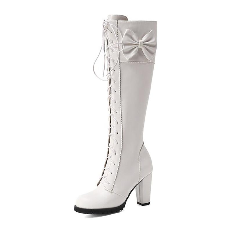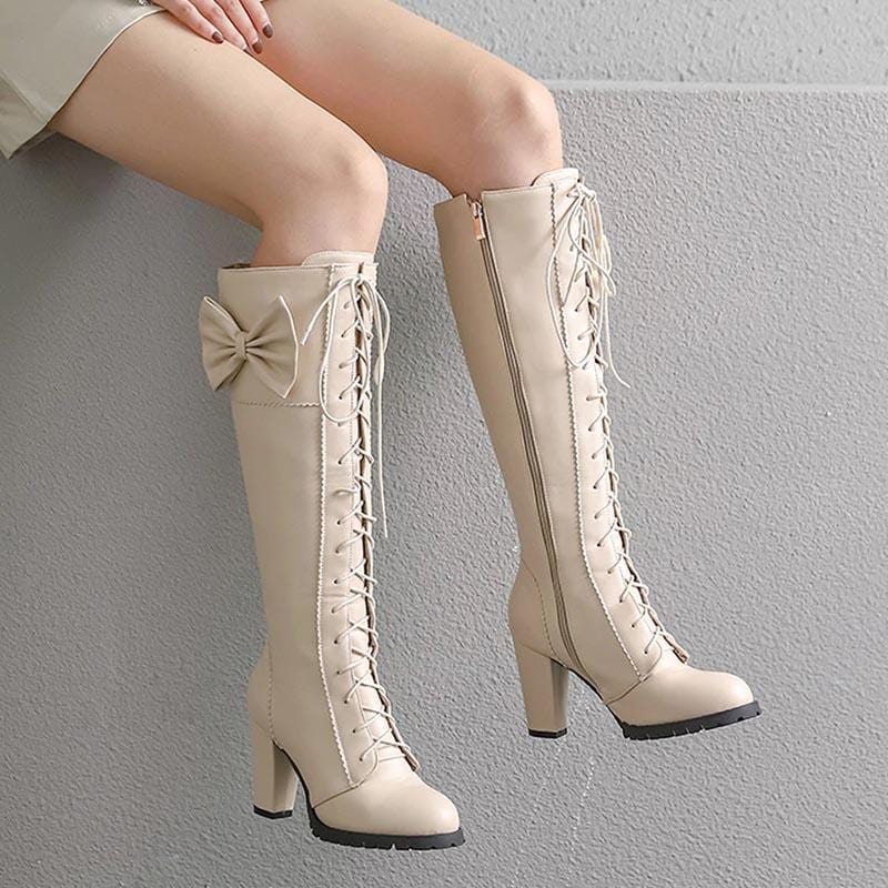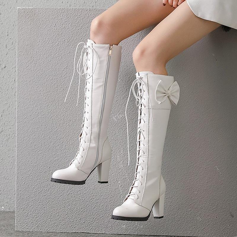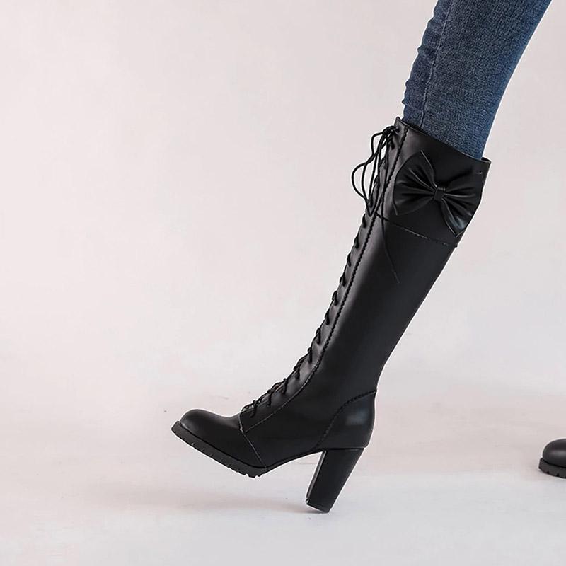 Valentina Goth Winter Boots will have ya feelin’ like a young bewitching chic! Get high in these slim tall boots that lace-up all the way with rounded toes. These boots are accessorized with ribbons as a finishing touch to bewitch the eyes of Its victims.
