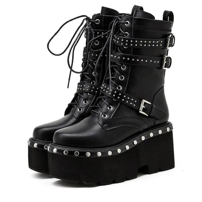 Let 'em know who's in charge in this Fancy Officer Tormented Boot featuring an ankle high shaft with three rivet buckle belts and lace-up tie closure. It has a solid high platform decorated with rivet metal pins that give off a badass gothic look!