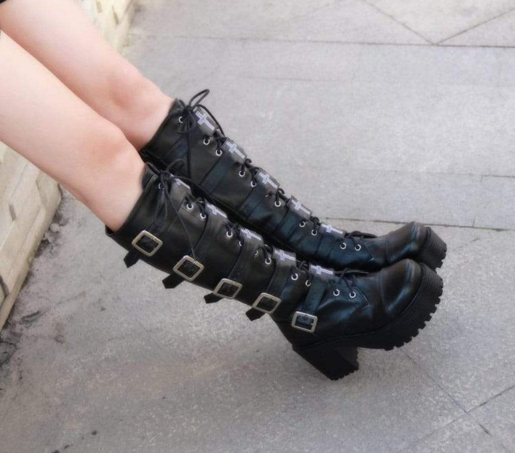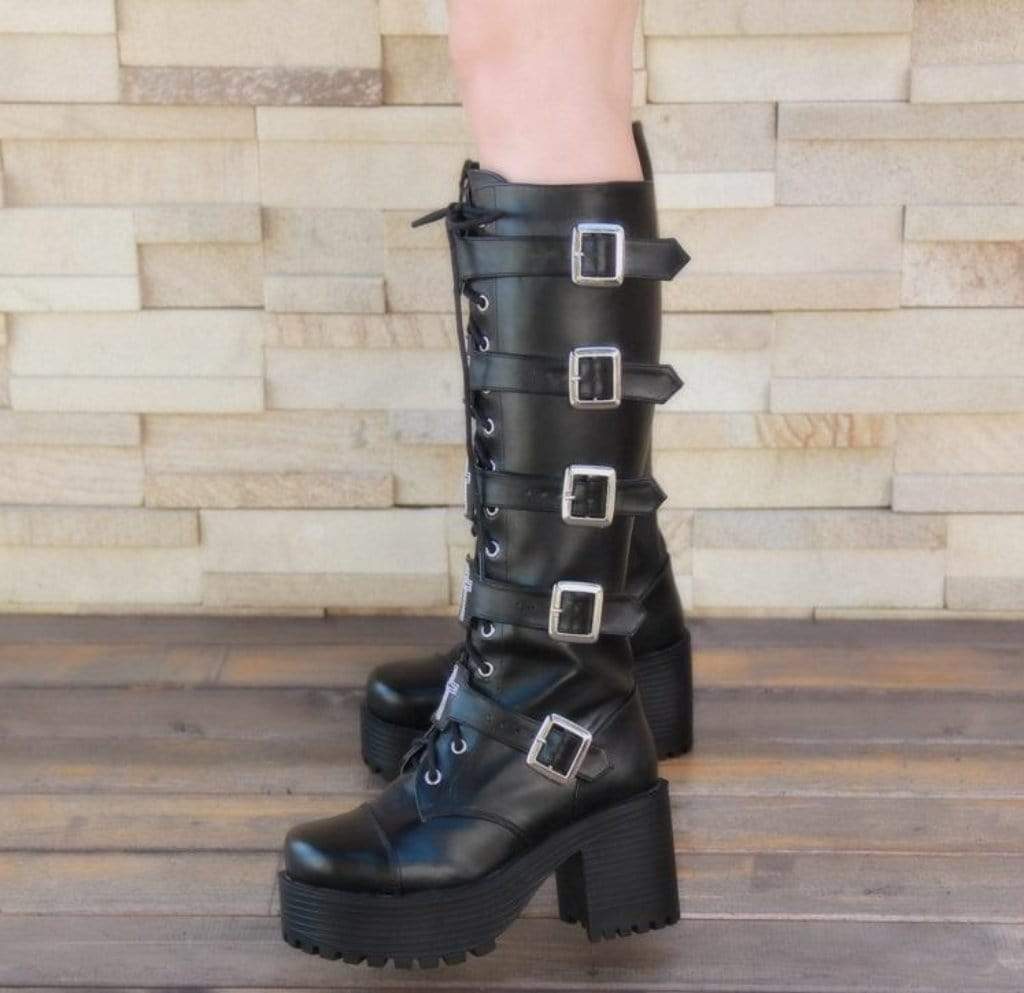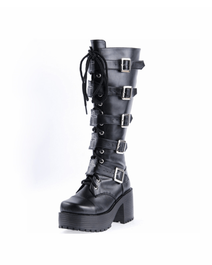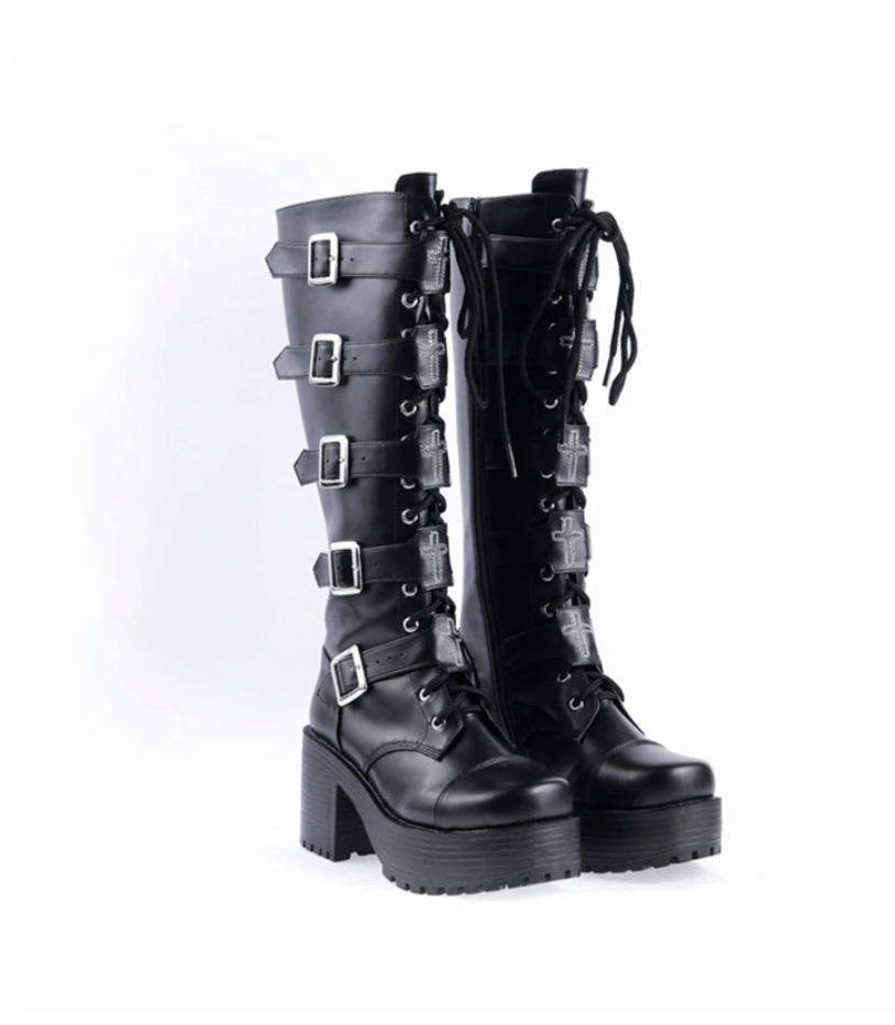 These black velvet boots have 5 buckles, comfy flat platforms, and lace up closures. Also, knee high so you can wear them over anything you want. The PU material, lace and soft leather are all about that comfort and style.