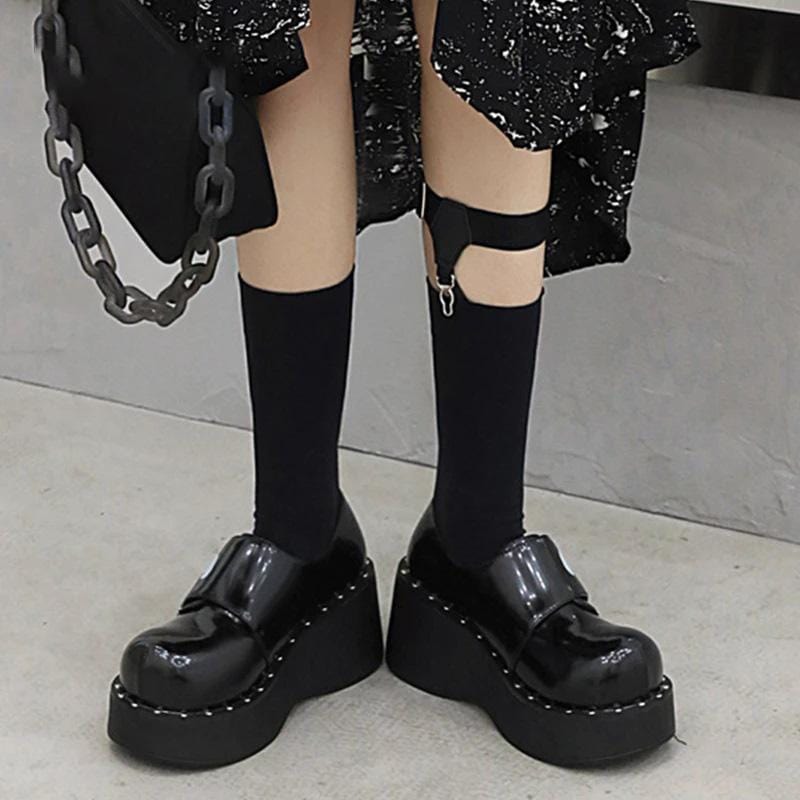 Make a bold statement in our Weak-Kneed Gothic Platform Shoes; with a studded thick sole to give you that extra height. Complete with skull poison decals- ideal for adding some attitude to yer everyday looks.